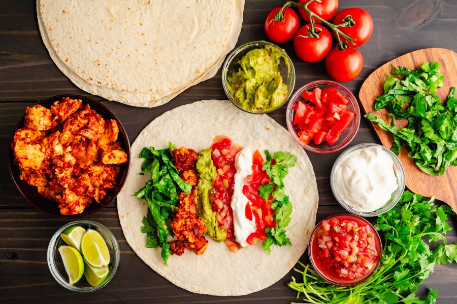 Garnir : tofu épicé, laitue, tomate, salsa, guacamole, crème sure.