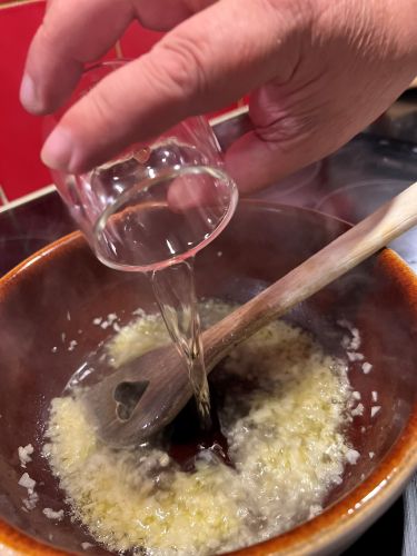 Versez la moitié du vin blanc sur les oignons.