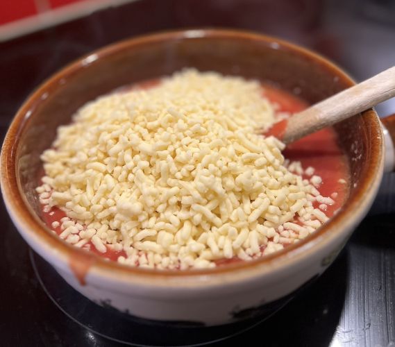 Incorporez petit à petit le fromage râpé dans le mélange de vin et de tomate tout en remuant constamment avec une cuillère en bois jusqu'à ce que le fromage soit fondu et que la fondue ait une consistance lisse.
