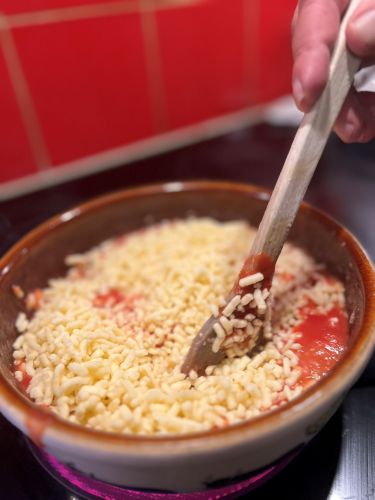 - Versez le mélange dans la fondue et remuez