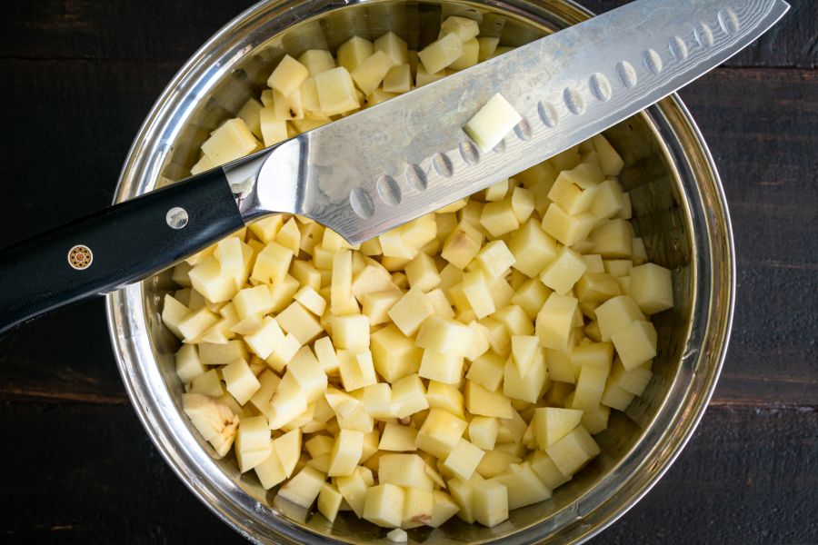 Couper les pommes de terre en petits carrés et les cuire dans l'eau bouillante. Essorer.