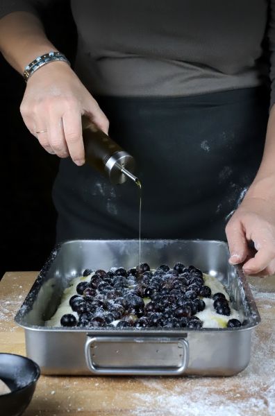 Saupoudrer le reste du sucre et arroser avec 40 ml d’huile d’olive.