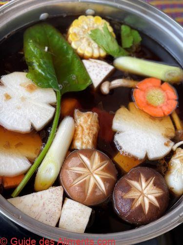- Cuire les légumes, tofu et nouilles progressivement dans le bouillon.