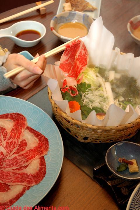 - Plonger une tranche de bœuf dans le bouillon quelques secondes, en la faisant légèrement bouger (shabu shabu) jusqu’à ce qu’elle soit cuite.