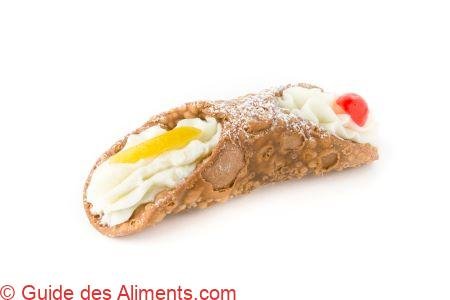 Cannoli : Des pâtisseries croustillantes en forme de tube, remplies d’une crème sucrée à base de ricotta, de sucre et de vanille, et souvent agrémentées de pépites de chocolat.