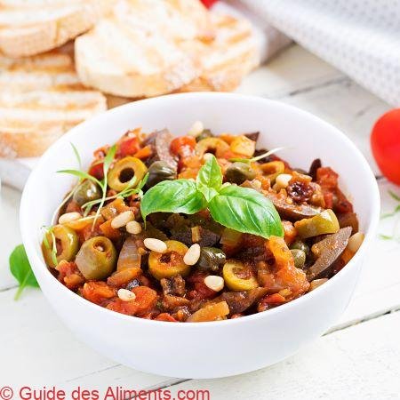 Caponata : Une salade aigre-douce à base d’aubergines, de câpres, de céleri, d’olives et de tomates.