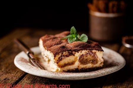Tiramisu : Un dessert italien populaire composé de couches alternées de biscuits imbibés de café, de mascarpone sucré et de cacao en poudre.