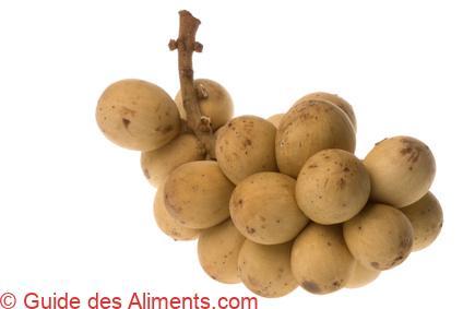 Le fruit peut être elliptique, ovale ou rond, mesurant 2 à 7 centimètres sur 1,5 à 5 centimètres de large. Il ressemblent à de petites pommes de terre portées en grappes semblables à des raisins. Les plus gros fruits sont portés par la variété appelée “duku”. Il est couvert de minces poils jaunes donner aspect un peu flou. L’épaisseur de la peau varie selon la variété, allant de 2 millimètres à environ 6 millimètres. Le fruit contient de cinq carpelles dont seulement 1 à 3 sont généralement développés et contiennent une graine plate, au goût amer. Les graines sont recouvertes d’un épais arille clair-blanc de goût doux-amer rappelant le raisin et le pamplemousse et généralement considéré comme excellent. Cette pulpe sucrée et juteuse contient du saccharose, du fructose et du glucose. Pour la consommation, les cultivars à des graines petites ou avortées avec un arille épais sont privilégiés.
