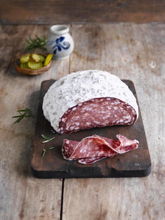 Ce salami pur porc est fabriqué de manière artisanale, le processus de maturation de sept semaines contribuant à sa peau blanche caractéristique, mais aussi à sa saveur riche. Délicieux dans un plat de charcuterie.